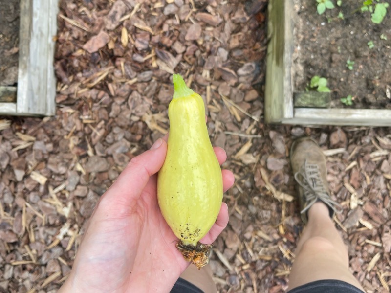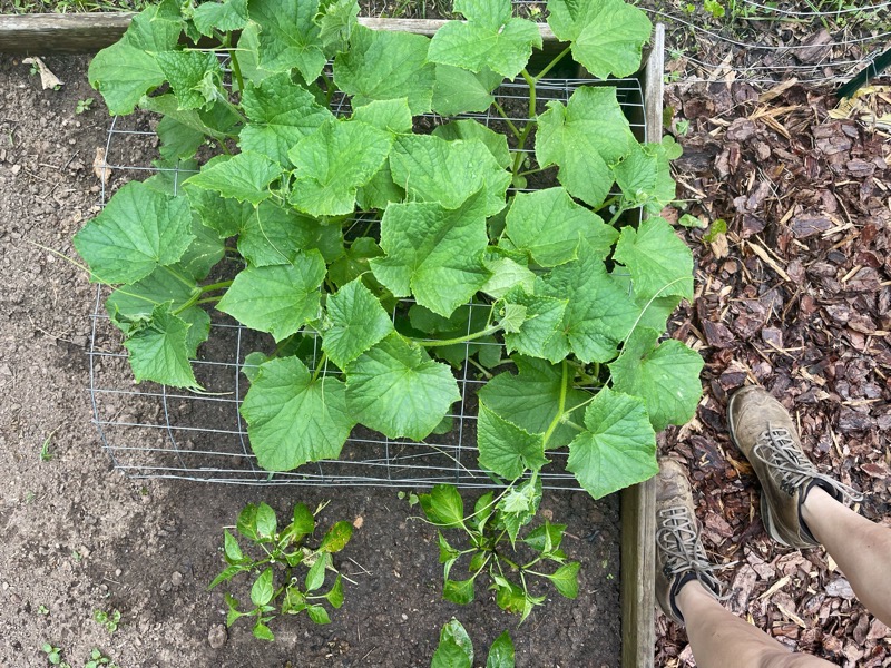 While Justin and I were cooking dinner last night, I walked down to the garden to pick some lettuce for our salad. Before I came back up with a huge bowl of spinach, kale, and two kinds of lettuce, I threaded my spaghetti squash through an overhead wire so it could grow better, like my cucumbers are doing now. I picked my first yellow squash. I pulled a few weeds and watered everything. I have no idea how many hours have been put into the garden, but I’ve worked in it a lot. I’m down there every single day, watering, weeding, admiring my work a little. The garden is growing and I feel a huge sense of accomplishment when I walk back to the house with my produce.