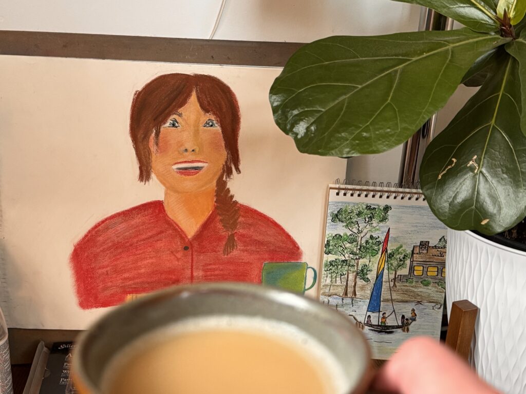 And then, after that, I barely touched the pastels. Maybe because they are super messy. Maybe because I started doing a lot of pencil sketches after that. Who knows why? All I know is that I have picked them up again and it is delightful. What is not delightful is that I still have a tendency to crouch in the floor when I use them. That is decidedly less than comfortable when you are almost 40 than it was at 22. I’m going to attempt to move to the table to work on them.