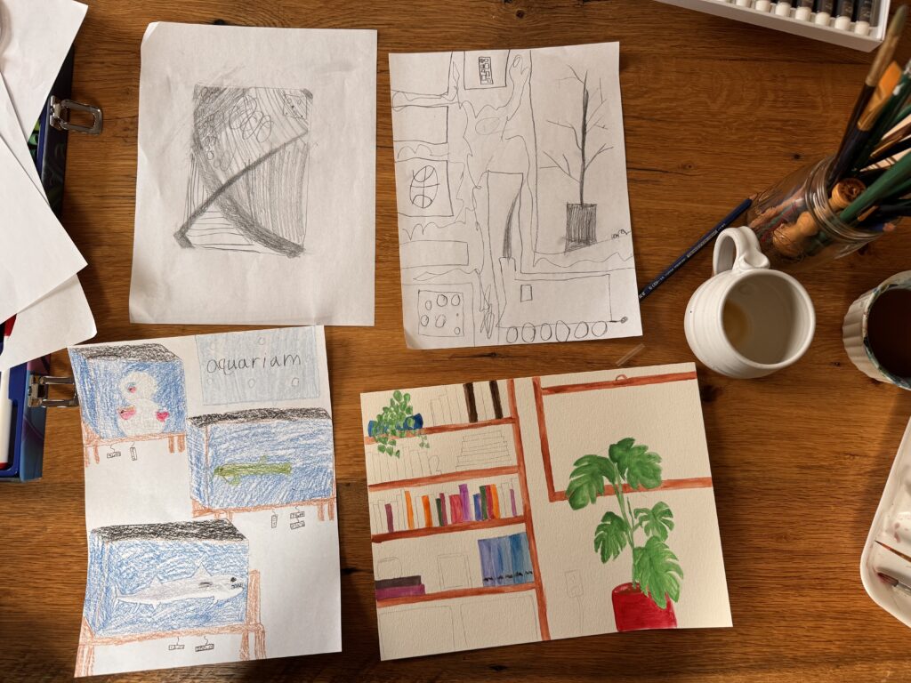 When I was at the art store (Hobby Lobby, guys), I bought some gouache paints to try out. But I had not tried them out. But this morning since the boys were out of school and we have been passing around the flu, I announced it was time for a group art project. And I got out my gouache paint.