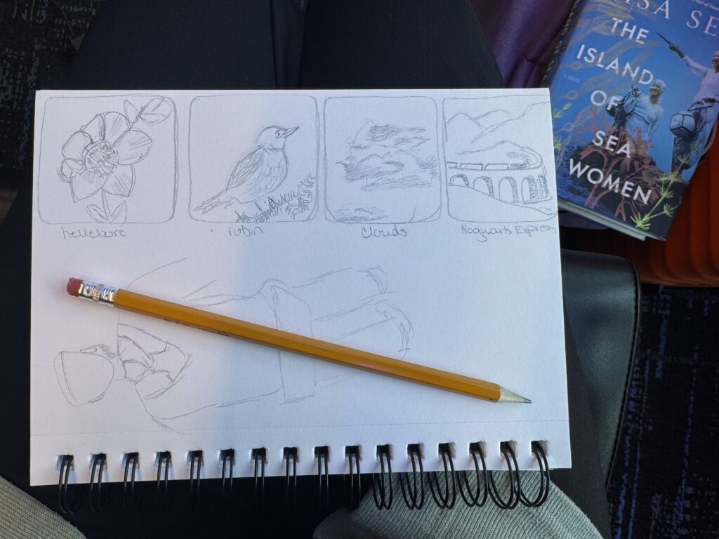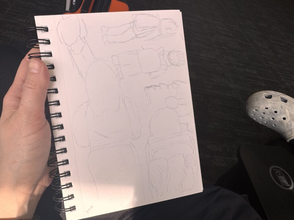 Last week I traveled again and knew that I wouldn’t start a big project. However, both travel days I did take some time to sketch while we were sitting in the airport. It’s quite a good way to spend some time.